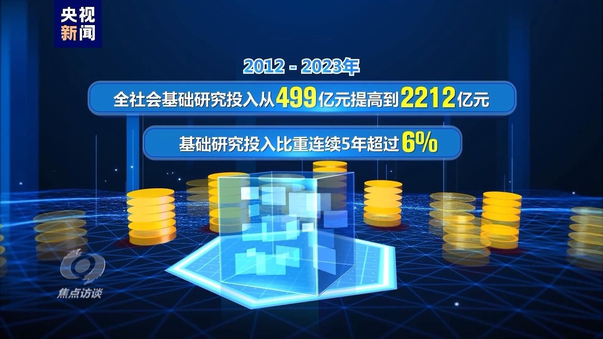 2012—2023年,全社會基礎(chǔ)研究投入從499億元提高到2212億元,基礎(chǔ)研究投入比重連續(xù)5年超過6%。