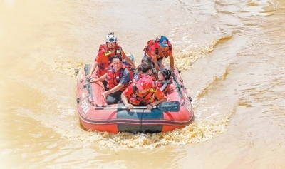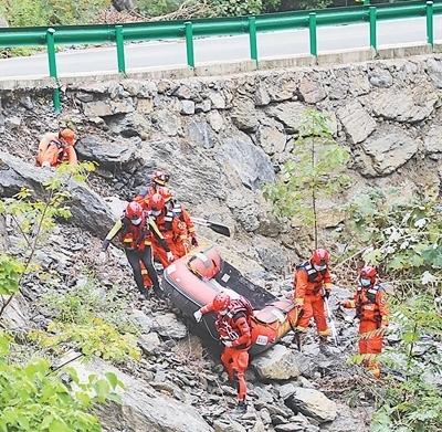湖北省消防救援總隊前突小組黨員突擊隊在陜西省商洛市腰坪水庫開展搜救。圖為消防救援人員運(yùn)送橡皮艇至作業(yè)水域。亓玉昆 李偉男攝影報道