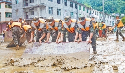 武警重慶總隊執(zhí)勤第五支隊官兵在重慶市黔江區(qū)白石鎮(zhèn)天河村清理道路上的淤泥。王湛銘攝(新華社發(fā))