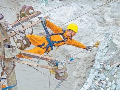 在四川省綿陽市平武縣,國網(wǎng)綿陽供電公司黨員突擊隊隊員在搶修輸電線路,他的身下就是滔滔洪水。田 海攝(人民視覺)