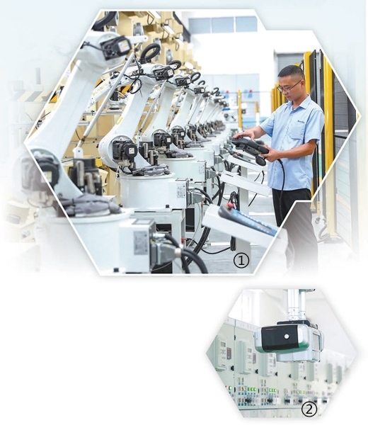 圖①:四川華鎣華鎣山經(jīng)開區(qū),企業(yè)員工在智能車間調(diào)試新安裝的機器人。邱海鷹攝(人民視覺) 圖②:寧夏銀川金鳳區(qū),智慧配電站房內(nèi)軌道式巡檢機器人正在開展自主巡檢。袁宏彥攝(人民視覺)