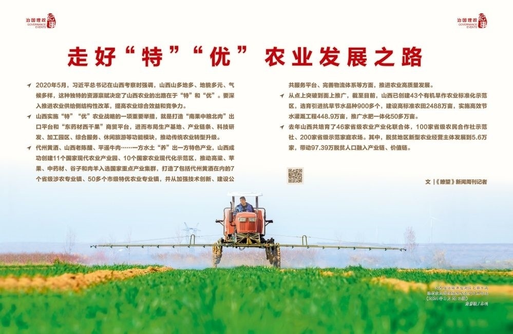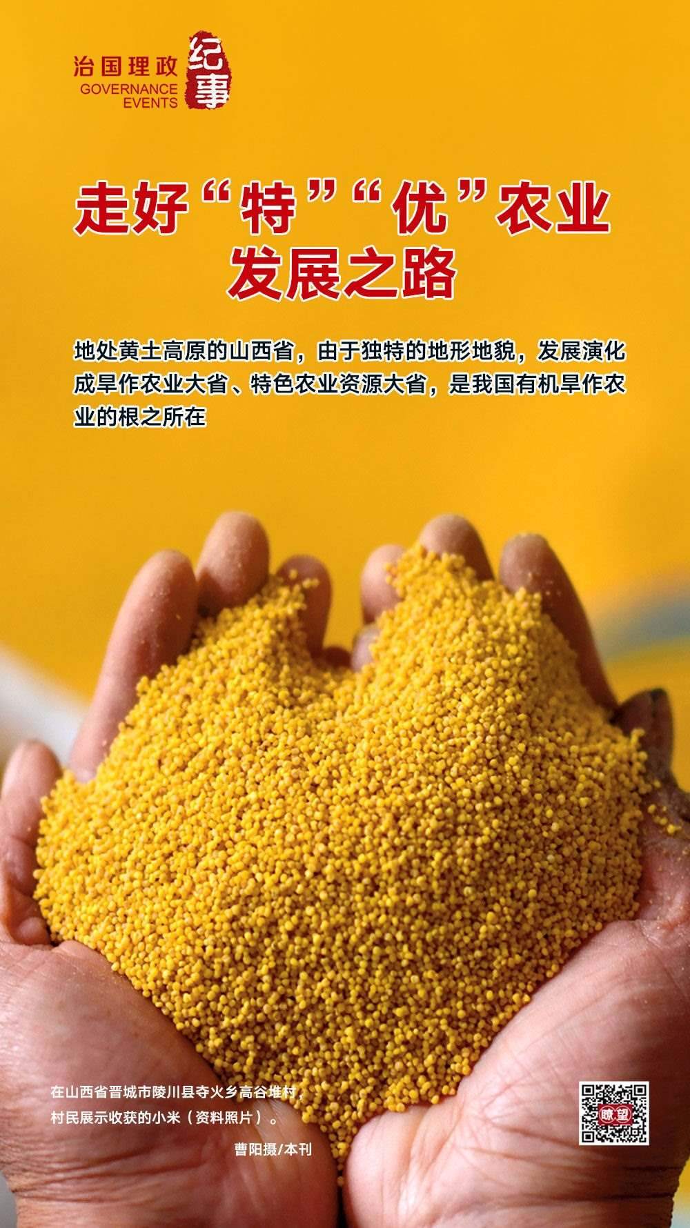 ◇2020年5月,習(xí)近平總書記在山西考察時強調(diào),山西山多地多、地貌多元、氣候多樣,這種獨特的資源稟賦決定了山西農(nóng)業(yè)的出路在于“特”和“優(yōu)”。要深入推進(jìn)農(nóng)業(yè)供給側(cè)結(jié)構(gòu)性改革,提高農(nóng)業(yè)綜合效益和競爭力。