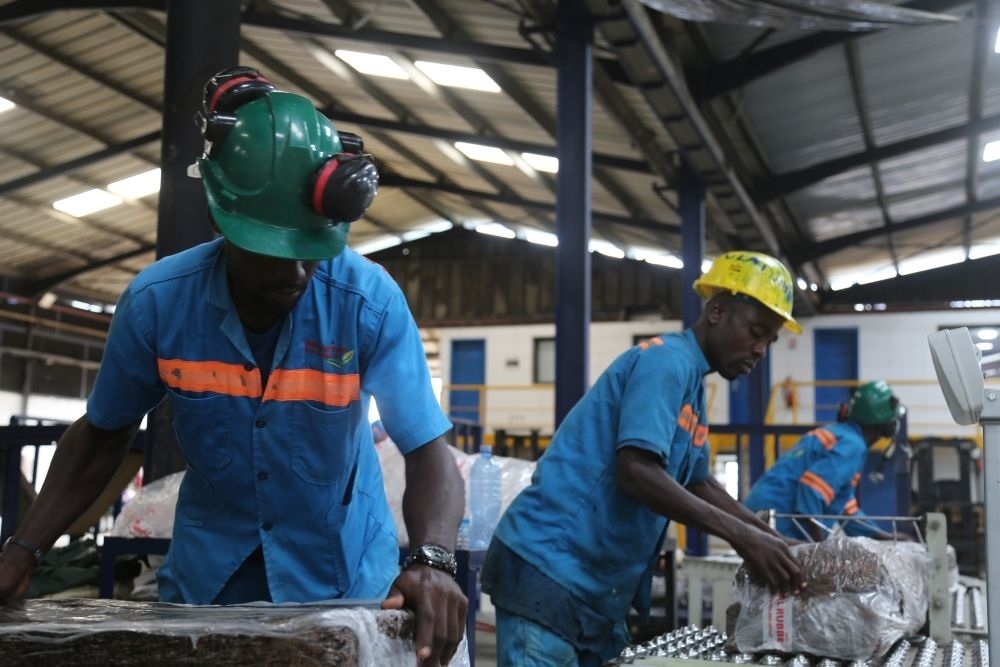 2024年6月10日,在科特迪瓦南部城鎮(zhèn)達布郊區(qū),工人們在美蘭橡膠加工廠對成品橡膠進行打包。中國加工廠幫助科特迪瓦橡膠增加產品附加值,提高膠農收入。
