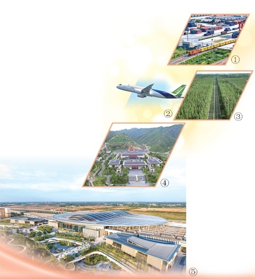 圖①:中歐班列從國鐵集團(tuán)鄭州局圃田車站駛出。國 徽攝(影像中國)圖②:國產(chǎn)大型客機C919。鄧智煒攝(新華社發(fā))圖③:新疆溫宿縣柯柯牙的“三北”防護(hù)林。新華社記者 李 響攝圖④:中國國家版本館中央總館。本報記者 陳 斌攝圖⑤:雄安站。宋 宇攝(影像中國)
