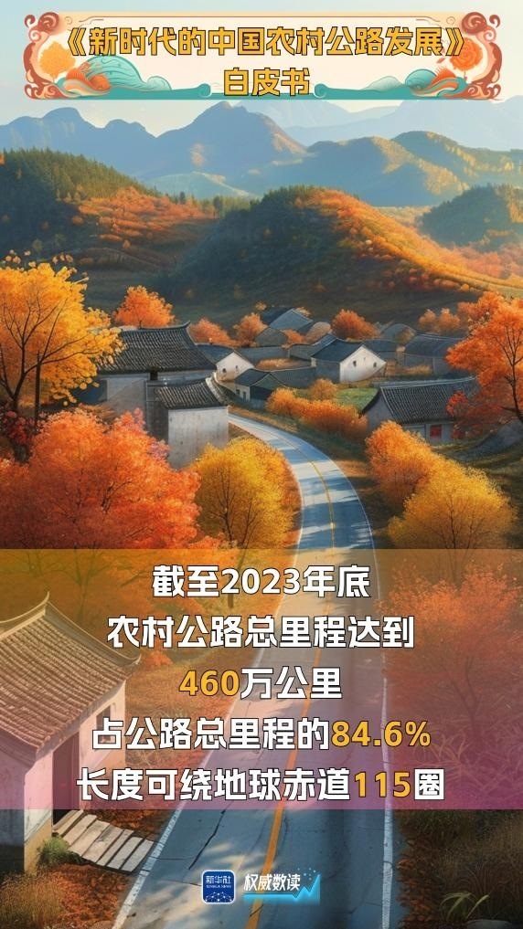 國務(wù)院新聞辦公室29日發(fā)布的《新時(shí)代的中國農(nóng)村公路發(fā)展》白皮書顯示,截至2023年底,我國農(nóng)村公路總里程增長(zhǎng)到460萬公里,占公路總里程的84.6%,目前已形成了“外通內(nèi)聯(lián)、通村暢鄉(xiāng)、客車到村、安全便捷”的農(nóng)村交通運(yùn)輸網(wǎng)絡(luò),帶動(dòng)農(nóng)村地區(qū)整體面貌發(fā)生了巨大變化。