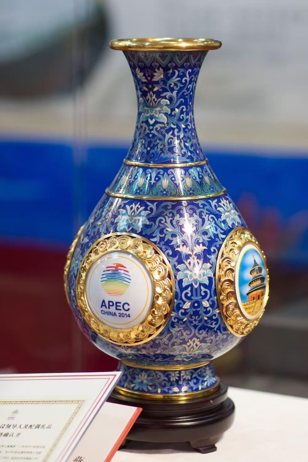2014年11月,北京APEC會議在雁棲湖畔舉行。為歡迎參會的各經(jīng)濟體領導人,習近平主席選定了一件國禮——“四海升平”景泰藍賞瓶。賞瓶的細節(jié)蘊含巧思:瓶高38厘米,是天壇祈年殿38米的等比例縮??;最大直徑21厘米,代表APEC的21個經(jīng)濟體。碧藍的瓶身雕著水紋,既象征“四?!币泊憝h(huán)太平洋?!捌俊笔恰捌健钡闹C音,連起來即“四海升平”。