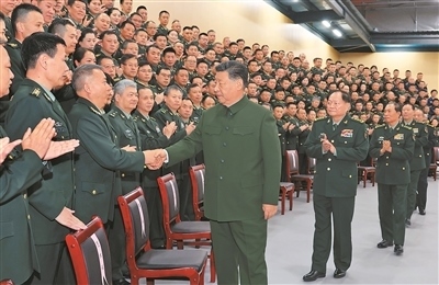 十二月四日,中共中央總書記、國家主席、中央軍委主席習(xí)近平視察信息支援部隊(duì),代表黨中央和中央軍委,對信息支援部隊(duì)第一次黨代表大會的召開表示熱烈祝賀,向信息支援部隊(duì)全體官兵致以誠摯問候。這是習(xí)近平同代表們親切握手。新華社記者 李 剛攝