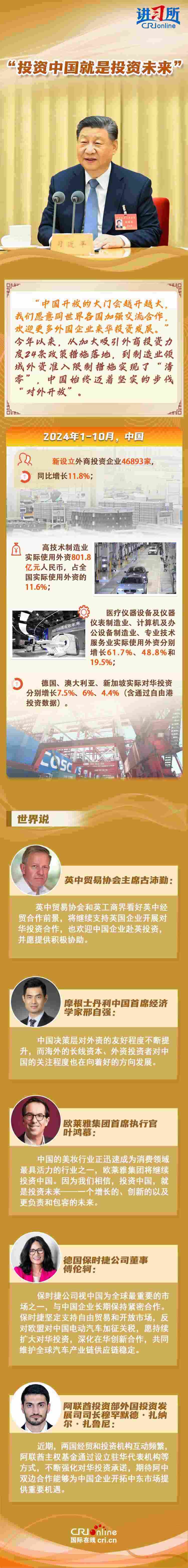 “中國是實干家、行動派?!苯衲暌詠?,從習(xí)近平主席的歐洲之行到拉美之行,再到四天前在北京會見主要國際經(jīng)濟組織負責(zé)人,習(xí)近平一直強調(diào),中國的發(fā)展將給世界帶來巨大機遇。據(jù)聯(lián)合國貿(mào)易和發(fā)展會議不久前發(fā)布的《世界投資報告2024》中文版顯示,中國吸引外資的結(jié)構(gòu)不斷優(yōu)化、質(zhì)量不斷提高,多位政商界人士也認為中國是一個非常有前景的市場,投資中國就是投資未來。