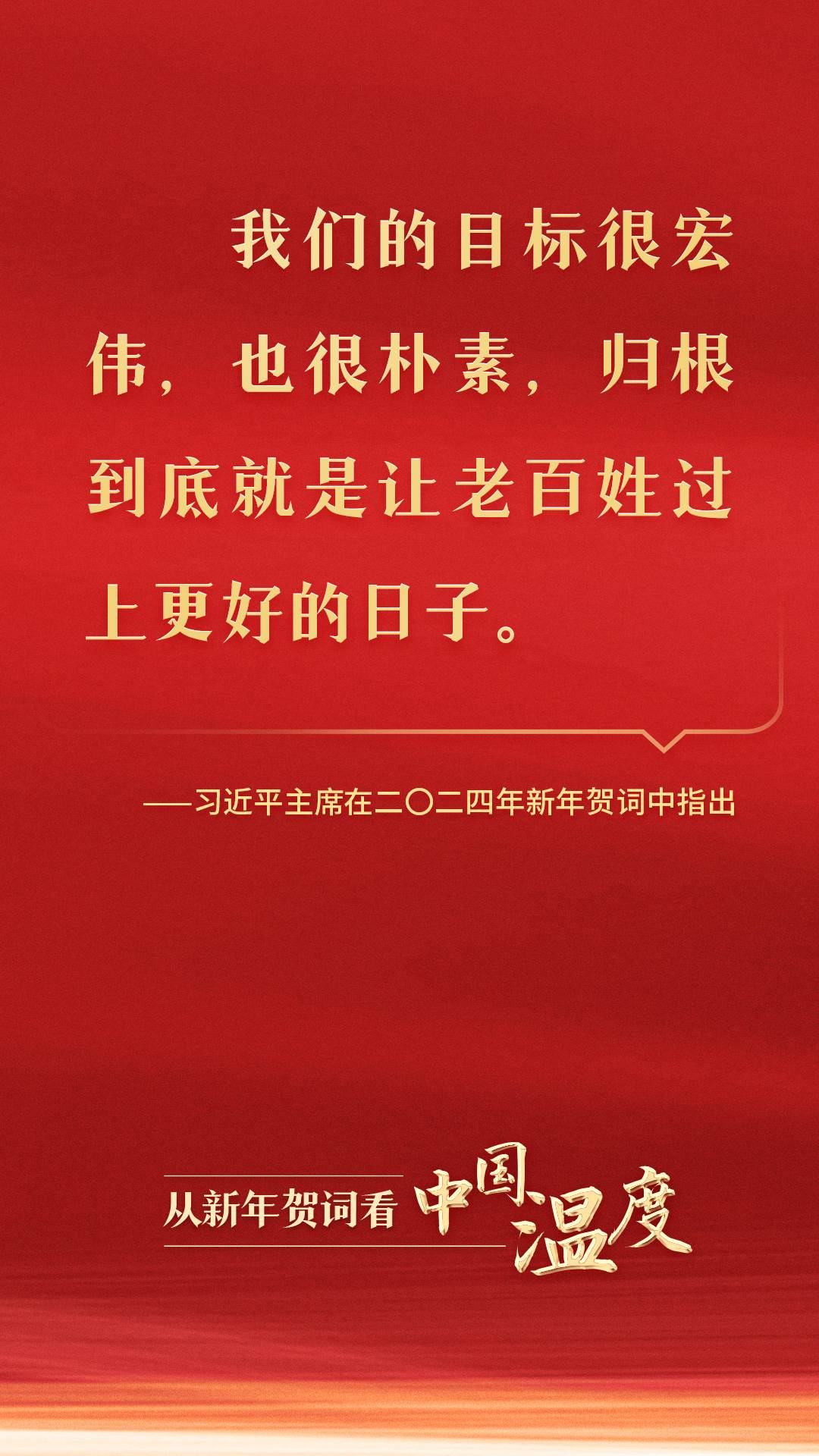 從黃土地走來,從大隊(duì)黨支部書記到黨和國家最高領(lǐng)導(dǎo)人,習(xí)近平同志深諳國情、社情、民情。在二〇二四年新年賀詞中,習(xí)近平主席話語懇切:“我們的目標(biāo)很宏偉,也很樸素,歸根到底就是讓老百姓過上更好的日子。”