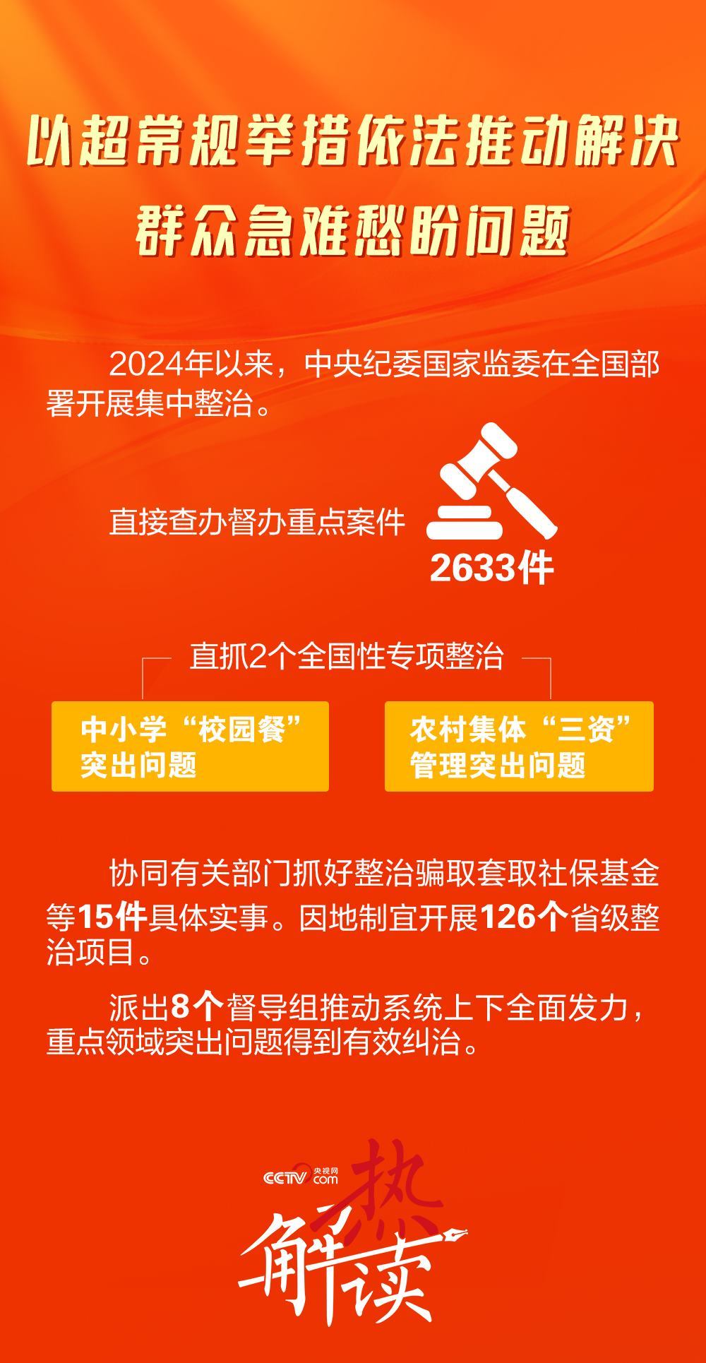 以“校園餐”問(wèn)題為例。2024年,中央紀(jì)委國(guó)家監(jiān)委督促有關(guān)部門首次摸清全國(guó)中小學(xué)食堂及供餐情況等底數(shù),指導(dǎo)各級(jí)監(jiān)察機(jī)關(guān)依法查處貪占學(xué)生餐費(fèi)、插手招標(biāo)采購(gòu)、收受回扣等問(wèn)題3.8萬(wàn)件,處分2.3萬(wàn)人。在斬?cái)嗌煜颉靶@餐”的“黑手”的同時(shí),補(bǔ)上了監(jiān)管制度的漏洞。中央紀(jì)委國(guó)家監(jiān)委會(huì)同教育部、市場(chǎng)監(jiān)管總局、財(cái)政部等單位,制定“校園餐”管理監(jiān)督指導(dǎo)意見(jiàn),推動(dòng)完善膳食經(jīng)費(fèi)管理等制度,確保每一筆資金來(lái)源與去向都在陽(yáng)光下透明運(yùn)作。