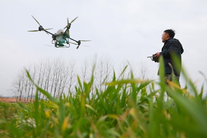 △2025年2月14日,在浙江杭州市臨安區(qū)天目山鎮(zhèn)“天目糧倉”糧食功能區(qū),農(nóng)機人員遙控植保無人機給小麥?zhǔn)┓省?/span>