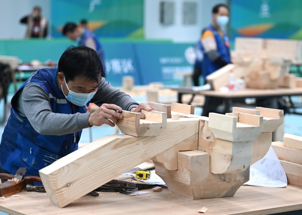 2023年3月25日,全國(guó)文物行業(yè)職業(yè)技能大賽在山西太原舉行,全國(guó)兩百余名選手現(xiàn)場(chǎng)比拼文物修復(fù)和考古探掘技術(shù)。這是參加木作文物修復(fù)師比賽項(xiàng)目的選手制作木質(zhì)傳統(tǒng)建筑構(gòu)件。