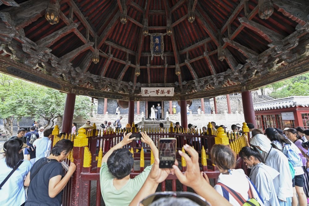 位于太原的晉祠,是祭祀西周初晉國(guó)首任諸侯唐叔虞的祠堂,是集中國(guó)古代祠祀建筑、園林、雕塑、壁畫(huà)、碑刻藝術(shù)于一體的珍貴的千年古祠,是首批全國(guó)重點(diǎn)文物保護(hù)單位之一。這是2024年7月25日,游客在晉祠博物館參觀(guān)。