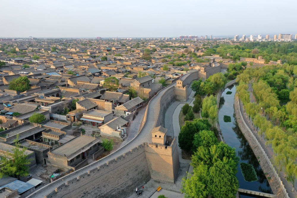 山西平遙古城城墻和護(hù)城河一角(2024年5月9日攝,無(wú)人機(jī)照片)。近年來(lái),當(dāng)?shù)卣ㄟ^(guò)加固城墻、維護(hù)歷史建筑、逐步建立古城違建整治長(zhǎng)效機(jī)制等措施,使這座“活著的古城”散發(fā)新的生機(jī)。