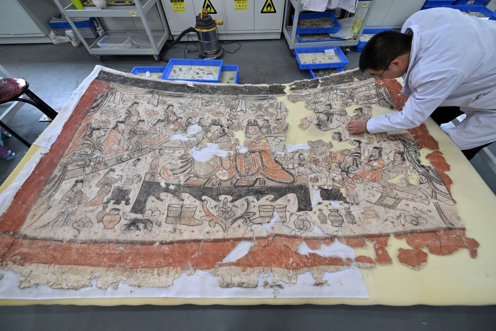 2024年2月27日,云岡研究院壁畫(huà)文物修復(fù)室工作人員王建國(guó)在修復(fù)壁畫(huà)。