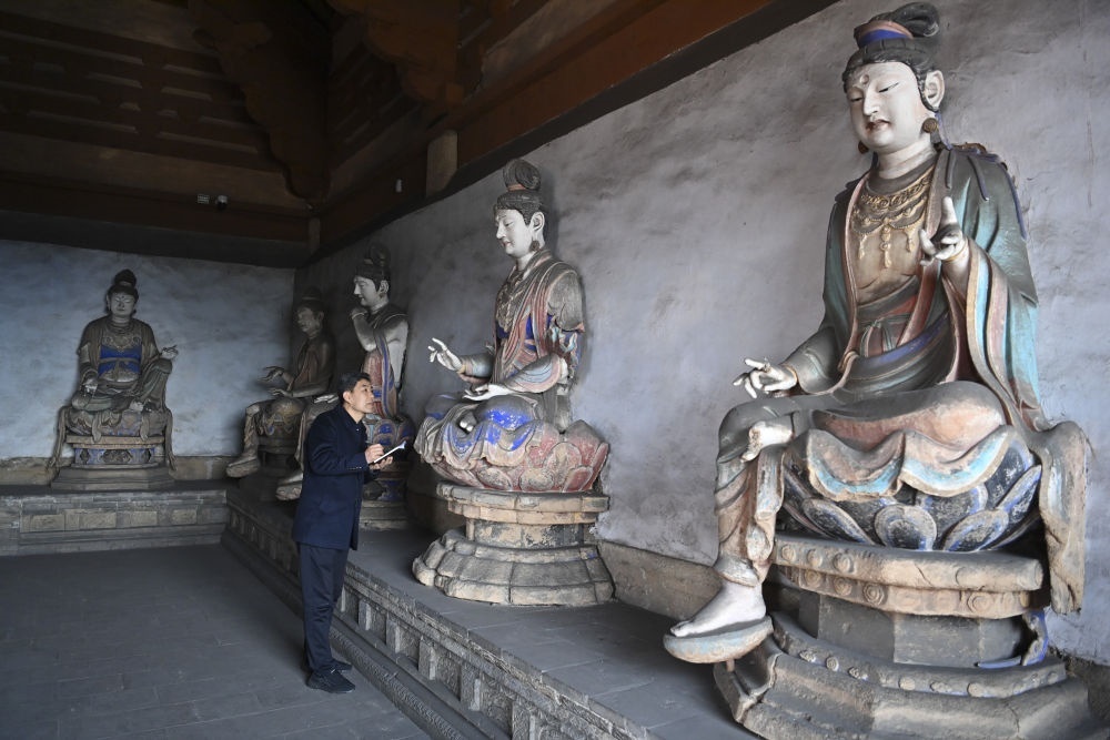 2024年3月16日,在山西長(zhǎng)子縣法興寺圓覺(jué)殿,天王寺法興寺崇慶寺文物所副所長(zhǎng)張宇飛記錄宋代彩塑的保存狀況。張宇飛從1993年開(kāi)始擔(dān)任法興寺文保員,在日常講解之余,他通過(guò)查閱史料、研讀碑文、請(qǐng)教專(zhuān)家、走訪(fǎng)鄉(xiāng)民等方式,挖掘文物背后的故事,通過(guò)自媒體發(fā)表介紹山西文化遺產(chǎn)的原創(chuàng)文章百余篇。