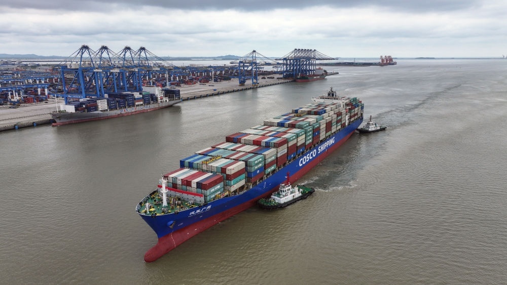 2024年5月19日,一艘海輪在廣西欽州港碼頭靠泊(無人機(jī)照片)。欽州港是北部灣港的組成部分,也是中國西南地區(qū)通往東盟的重要出??凇N鞑筷懞P峦ǖ览描F路、公路、水運(yùn)等多種運(yùn)輸方式,由重慶一路向南,經(jīng)廣西北部灣出海通達(dá)世界各地。截至2025年1月1日,北部灣港總航線達(dá)80條,其中外貿(mào)航線49條,基本實(shí)現(xiàn)國內(nèi)主要港口和東南亞、東北亞主要港口全覆蓋。