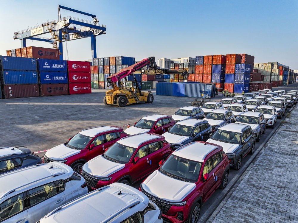 2024年10月28日在重慶國際物流樞紐園區(qū)西部陸海新通道重慶無水港拍攝的出口汽車裝運(yùn)現(xiàn)場(無人機(jī)照片)。位于重慶市沙坪壩區(qū)的重慶國際物流樞紐園區(qū),是重慶中歐班列、西部陸海新通道班列、渝滿俄班列、渝甬班列的主要到發(fā)點(diǎn),截至2024年10月,已開通班列線路62條,輻射125個國家和地區(qū)的542個港口。