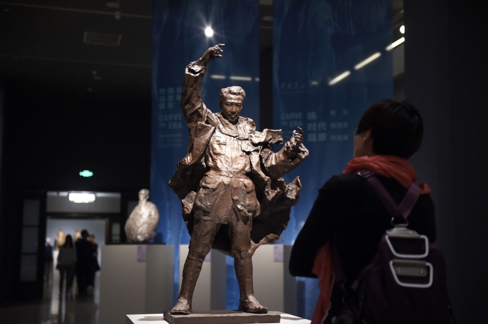 2018年4月1日,參觀(guān)者在北京的中國(guó)美術(shù)館參觀(guān)雕塑作品“冼星?!?。新華社記者 魯鵬攝