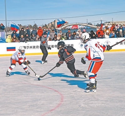 2月22日至23日,2025中俄國(guó)際冬季體育系列比賽在中國(guó)黑河市和俄羅斯布拉戈維申斯克市之間的黑龍江江面上舉行。圖為中俄少年組冰球隊(duì)員在賽場(chǎng)上激烈角逐。
