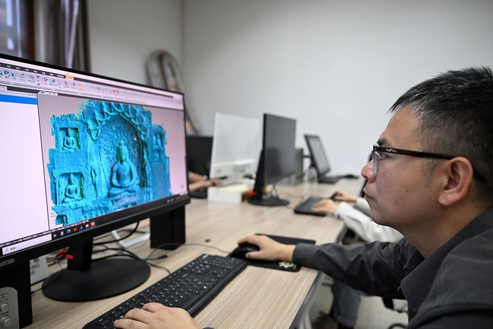 2025年4月10日,龍門石窟研究院工作人員進(jìn)行3D建模工作。