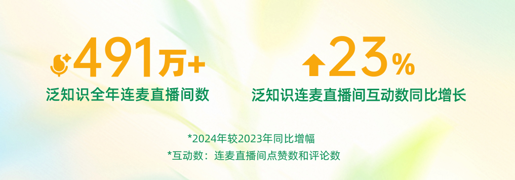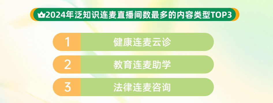 隨著用戶互動(dòng)與創(chuàng)作者投稿形成正向循環(huán),推動(dòng)生態(tài)雙向繁榮,連麥學(xué)習(xí)正重塑知識(shí)普惠的全新范式。數(shù)據(jù)顯示,2024年,快手泛知識(shí)連麥直播場次達(dá)491萬場,直播間互動(dòng)量同比提升23%,健康咨詢、教育助學(xué)、法律咨詢位列連麥內(nèi)容前三?! ?/p>