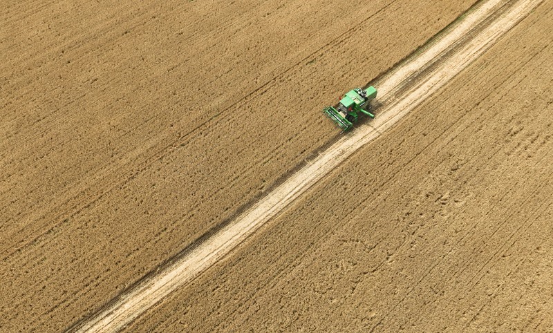 6月18日,收割機在山東省煙臺市一處試驗田里收割小麥(無人機照片)。