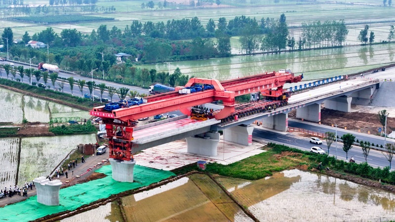 6月21日,在濰宿高鐵中鐵上海局郯城制梁場,提梁機在提運箱梁(無人機照片)。