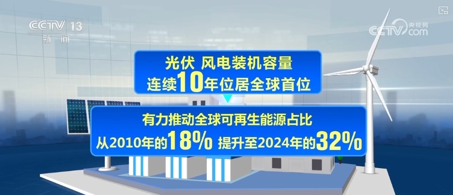 《報告》指出,作為全球最大能源消費(fèi)國與清潔能源投資國,2024年,中國清潔能源投資規(guī)模為6250億美元,占全球比重的三分之一。光伏、風(fēng)電裝機(jī)容量連續(xù)10年位居全球首位,有力推動全球可再生能源占比從2010年的18%提升至2024年的32%。