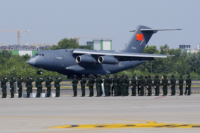 9月12日,第十二批在韓中國人民志愿軍烈士遺骸回國。這是接運(yùn)烈士遺骸回國的運(yùn)-20飛機(jī)降落在沈陽桃仙國際機(jī)場。