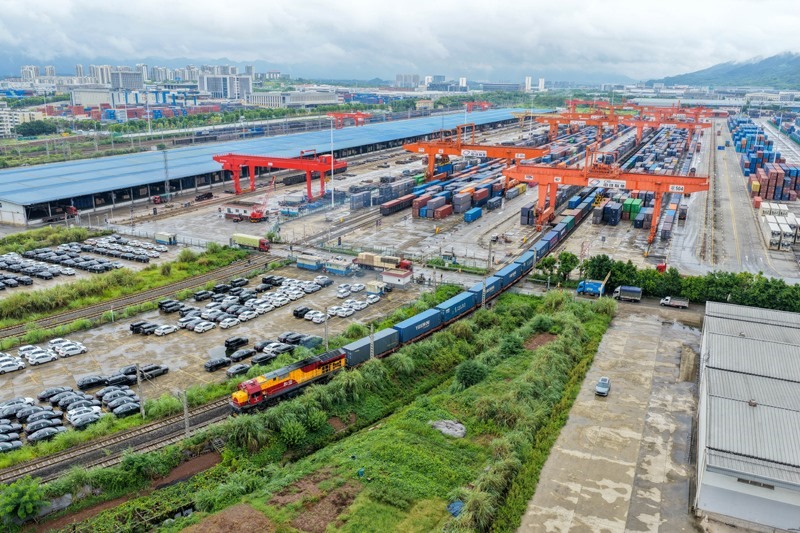 9月13日,滿載汽車零配件、筆記本電腦等貨物的中亞班列在重慶團(tuán)結(jié)村中心站發(fā)車(無人機(jī)照片)。