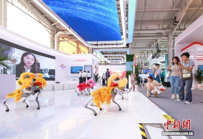 9月10日,2025年中國國際服務(wù)貿(mào)易交易會(huì)在北京首鋼園開幕。圖為觀眾參觀機(jī)器狗群舞表演。中新社記者 賈天勇 攝