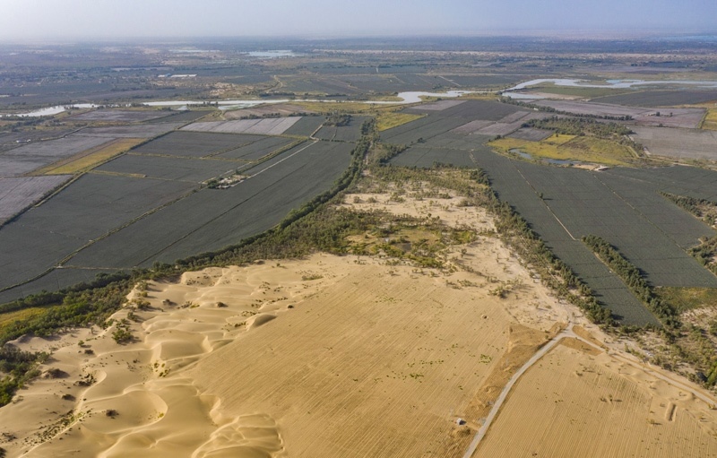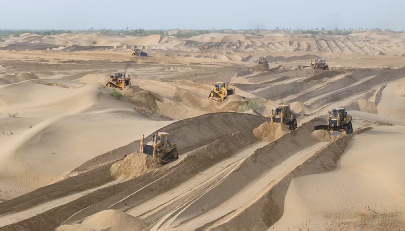 5月22日,在新疆尉犁縣境內(nèi)的塔里木河南岸防沙治沙區(qū),大型機(jī)械在平整沙丘(無人機(jī)照片)。