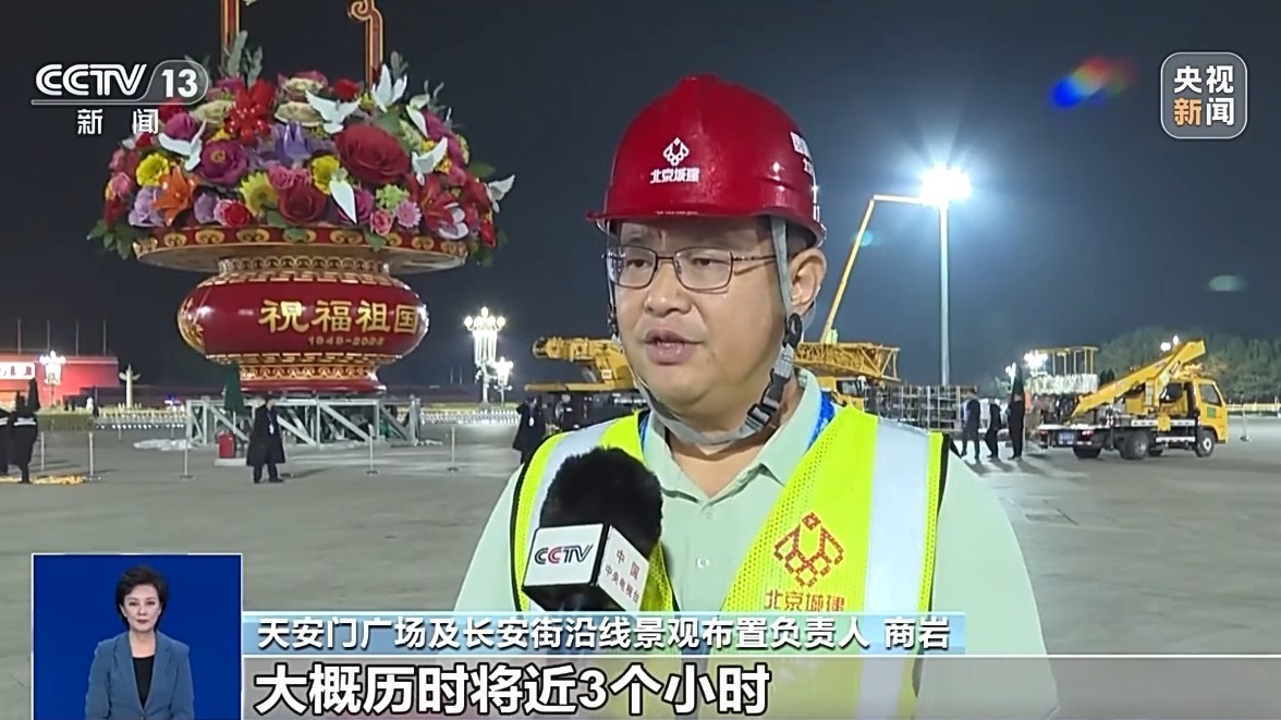 天安門廣場及長安街沿線景觀布置負(fù)責(zé)人 商巖:從吊裝準(zhǔn)備工作開始,一直到吊裝完成,大概歷時(shí)將近3個小時(shí)。保證籃盤和籃體的緊密結(jié)合,因?yàn)榛ɑ@在插置的過程中有一個觀賞角度,所以在吊裝和合龍整個過程當(dāng)中,四面相應(yīng)的觀賞面都要有工作人員要盯著,這個面不能有任何的變化。