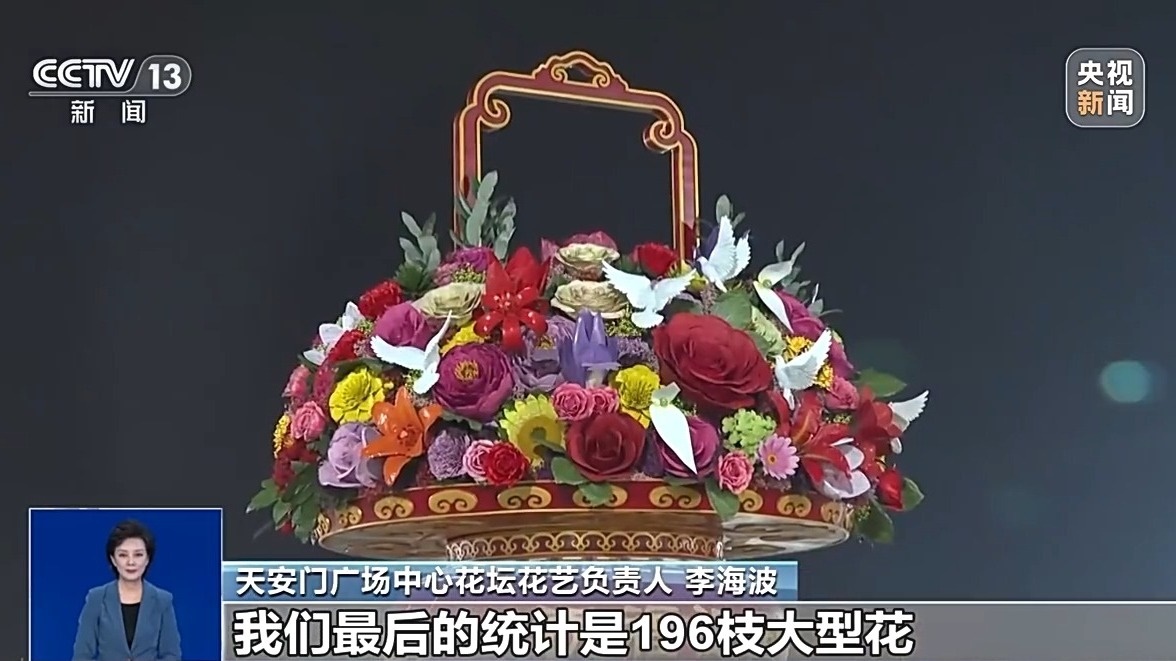 總臺記者 魏雨彤:今年的“祝福祖國”花籃籃體高16米,籃內(nèi)選取了18種美好寓意的花卉,比如說月季,首次作為焦點(diǎn)花寓意和平希望,向日葵寓意自由幸福。值得一提的是,今年還首次將靈動的動物元素融入其中,10只和平鴿正以三種不同的姿態(tài)翱翔于花籃之上,成為今年的新亮點(diǎn)。