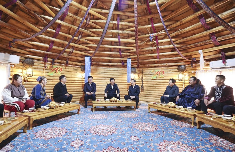 9月27日,受習(xí)近平總書記囑托,中共中央政治局常委、全國(guó)政協(xié)主席、中央代表團(tuán)團(tuán)長(zhǎng)王滬寧帶領(lǐng)中央代表團(tuán)部分成員到阿勒泰地區(qū)布爾津縣考察。這是王滬寧和中央代表團(tuán)部分成員在扎拉特鄉(xiāng)村旅游專業(yè)合作社同村民交流。新華社記者 姚大偉 攝