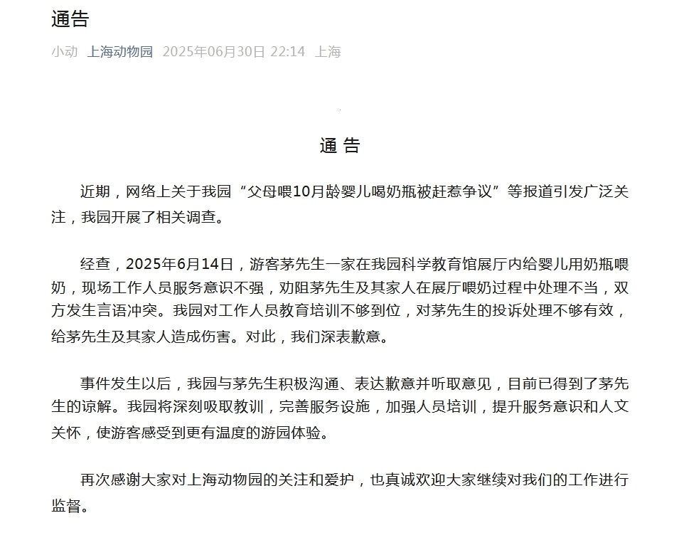 《通告》中稱,經(jīng)查,2025年6月14日,游客茅先生一家在該動物園科學(xué)教育館展廳內(nèi)給嬰兒用奶瓶喂奶,現(xiàn)場工作人員服務(wù)意識不強,勸阻茅先生及其家人在展廳喂奶過程中處理不當(dāng),雙方發(fā)生言語沖突。對工作人員教育培訓(xùn)不夠到位,對茅先生的投訴處理不夠有效,給茅先生及其家人造成傷害。對此,上海動物園深表歉意。