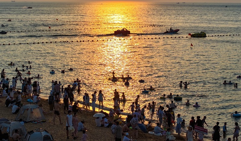 7月5日,游客在山東省威海市國(guó)際海水浴場(chǎng)親水消暑(無(wú)人機(jī)照片)。