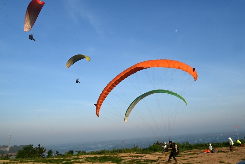 7月5日,游客在山東省榮成市愛(ài)倫灣海濱體驗(yàn)滑翔傘運(yùn)動(dòng)。
