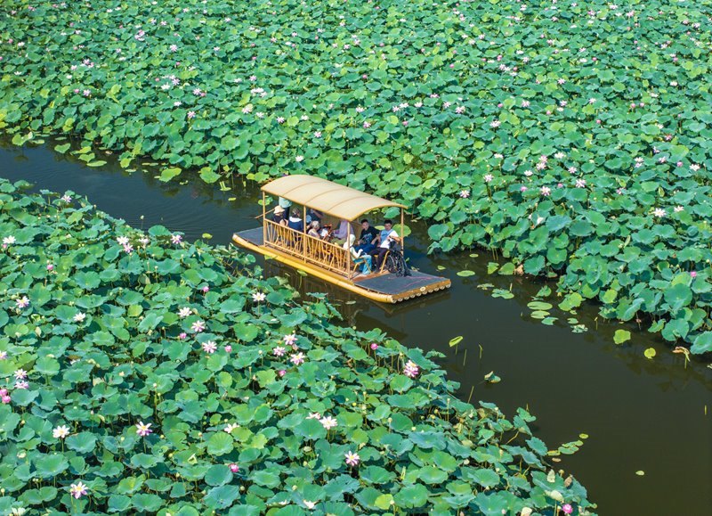 7月6日,游客在江蘇省興化市萬(wàn)畝荷塘景區(qū)賞荷游玩(無(wú)人機(jī)照片)。