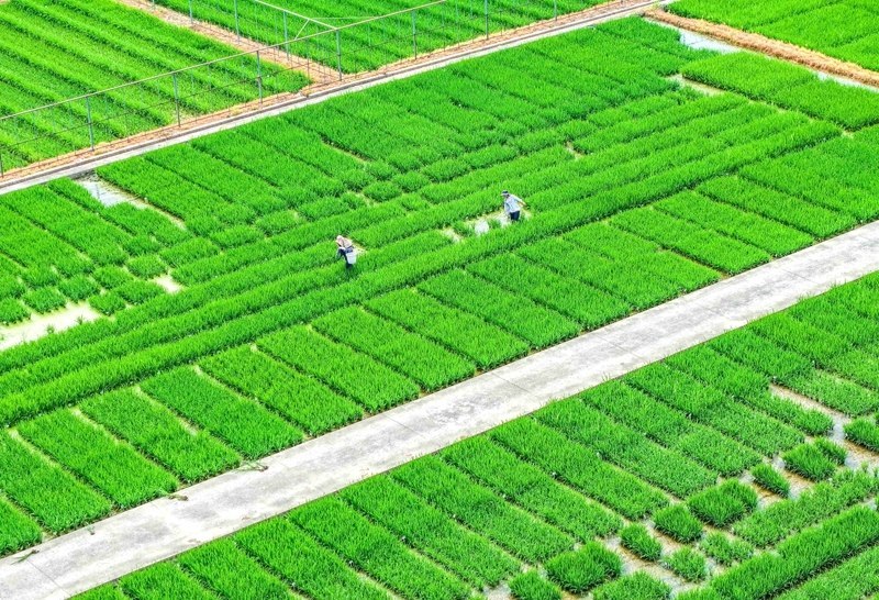 7月7日,在江蘇里下河地區(qū)農(nóng)科所(揚(yáng)州市農(nóng)科院),農(nóng)民在試驗(yàn)田勞作(無(wú)人機(jī)照片)。