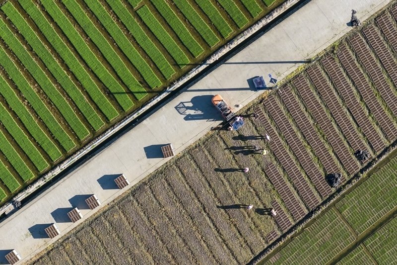 7月7日,浙江省余姚市黃家埠鎮(zhèn)上塘村農(nóng)民在田間擺放晚稻秧盤(pán)(無(wú)人機(jī)照片)。