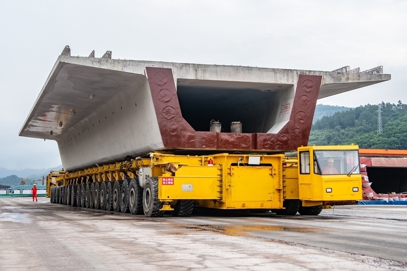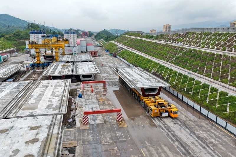 7月10日,在西渝高鐵陳家溝特大橋附近的制梁場,運梁機在進行箱梁轉運作業(yè)。