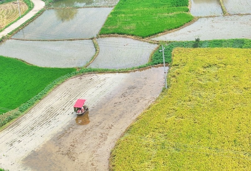 7月13日,湖南省衡陽市衡東縣霞流鎮(zhèn)農(nóng)民駕駛農(nóng)機翻耕稻田(無人機照片)。