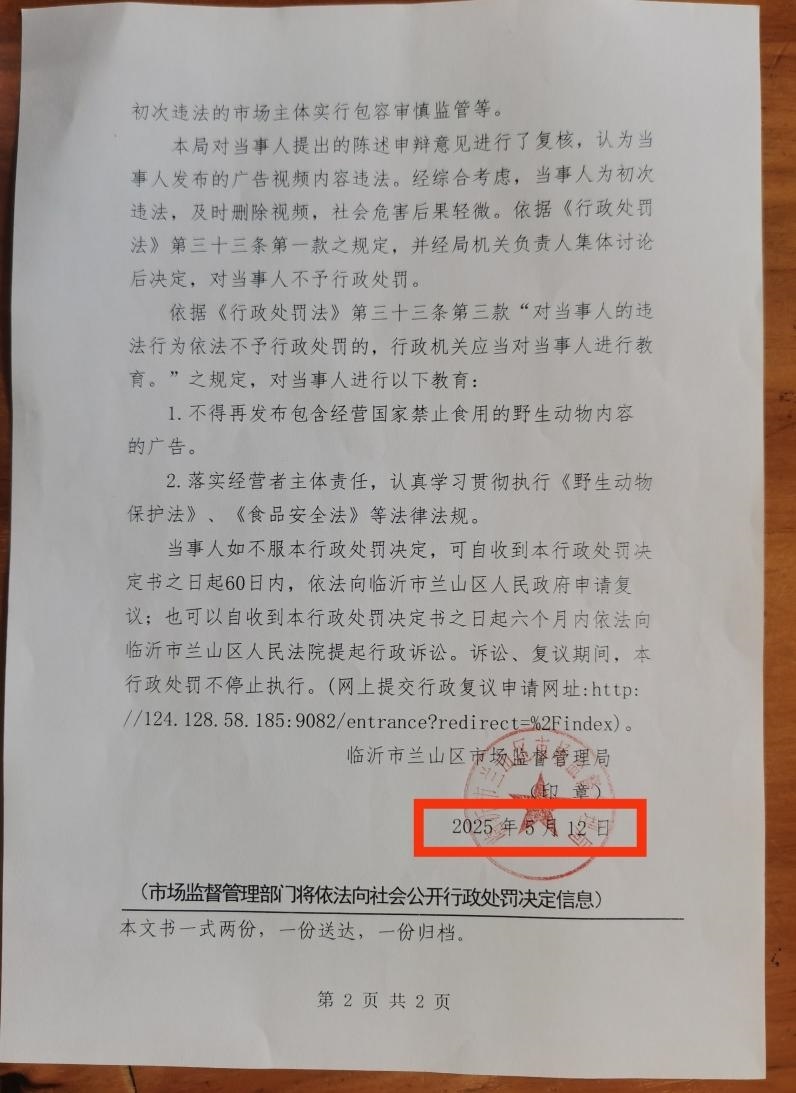 7月14日,山東臨沂“拍蛤蟆湯視頻被罰45萬元”事件迎來最新進展。代理此案的律師龔華告訴津云新聞記者,涉事飯館收到當?shù)厥袌霰O(jiān)管局送達的《不予行政處罰決定書》,但落款時間卻為5月12日,其認為本次送達的程序不合規(guī)。