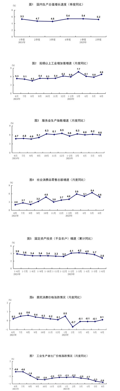 2024年各季度及2025年一季度、二季度GDP環(huán)比增速分別為1.4%、1.0%、1.3%、1.6%、1.2%和1.1%。