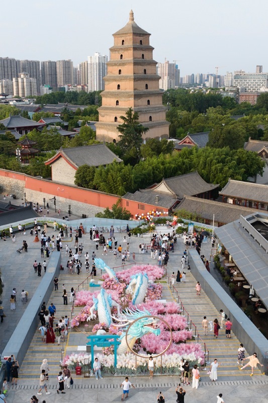 游客在位于西安大雁塔附近的大悅城觀景平臺(tái)上游玩拍照(7月16日攝,無(wú)人機(jī)照片)。