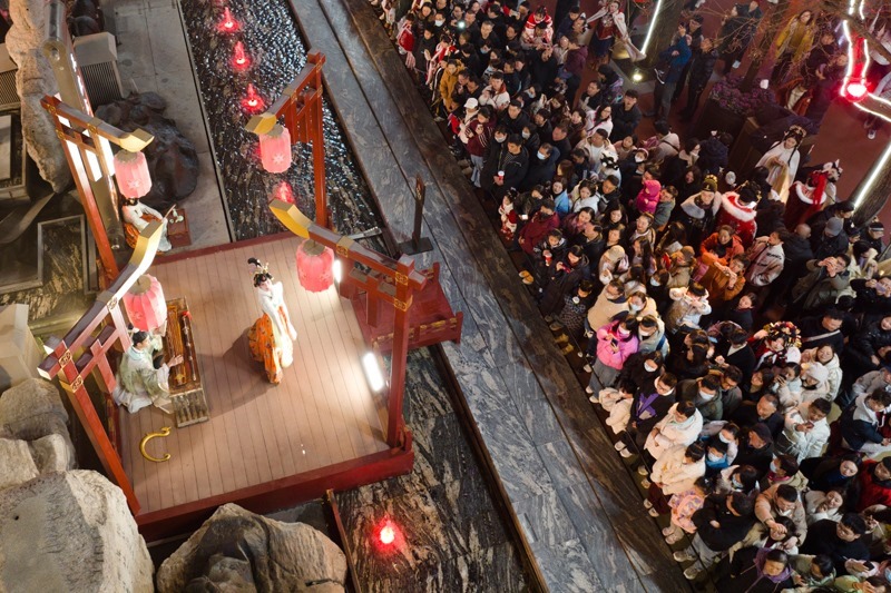 游客在西安大唐不夜城街區(qū)觀看以唐代歷史文化為背景創(chuàng)作的情景?。?月22日攝,無(wú)人機(jī)照片)。