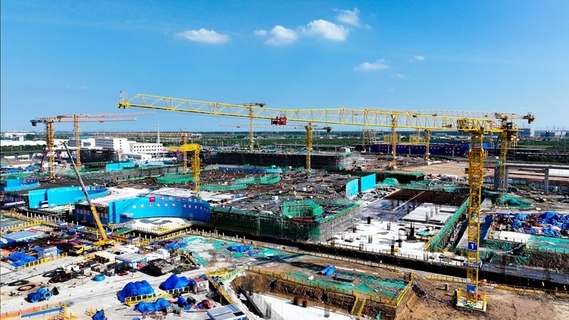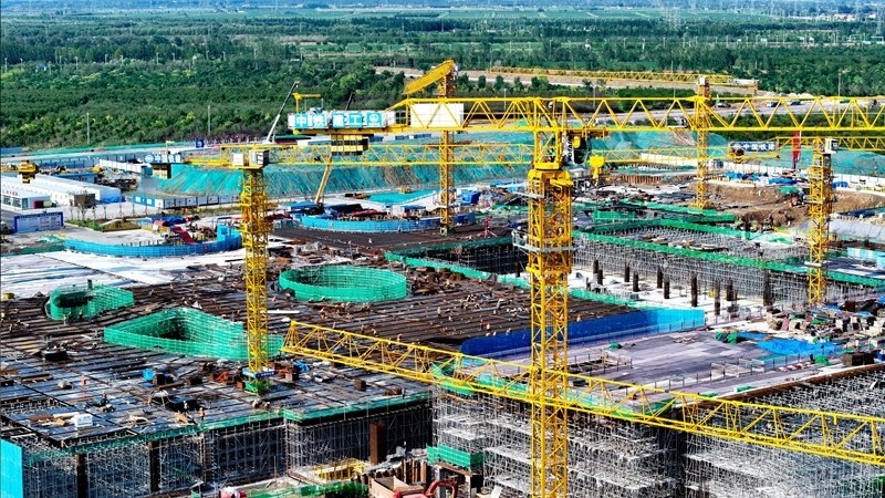 7月25日,在津?yàn)H高鐵山東東營高鐵站現(xiàn)代綜合客運(yùn)樞紐及配套工程建設(shè)現(xiàn)場(chǎng),中鐵二十局工作人員在施工(無人機(jī)照片)。