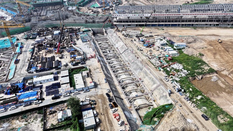 7月30日拍攝的濟(jì)濱高鐵機(jī)場隧道施工現(xiàn)場(無人機(jī)照片)。